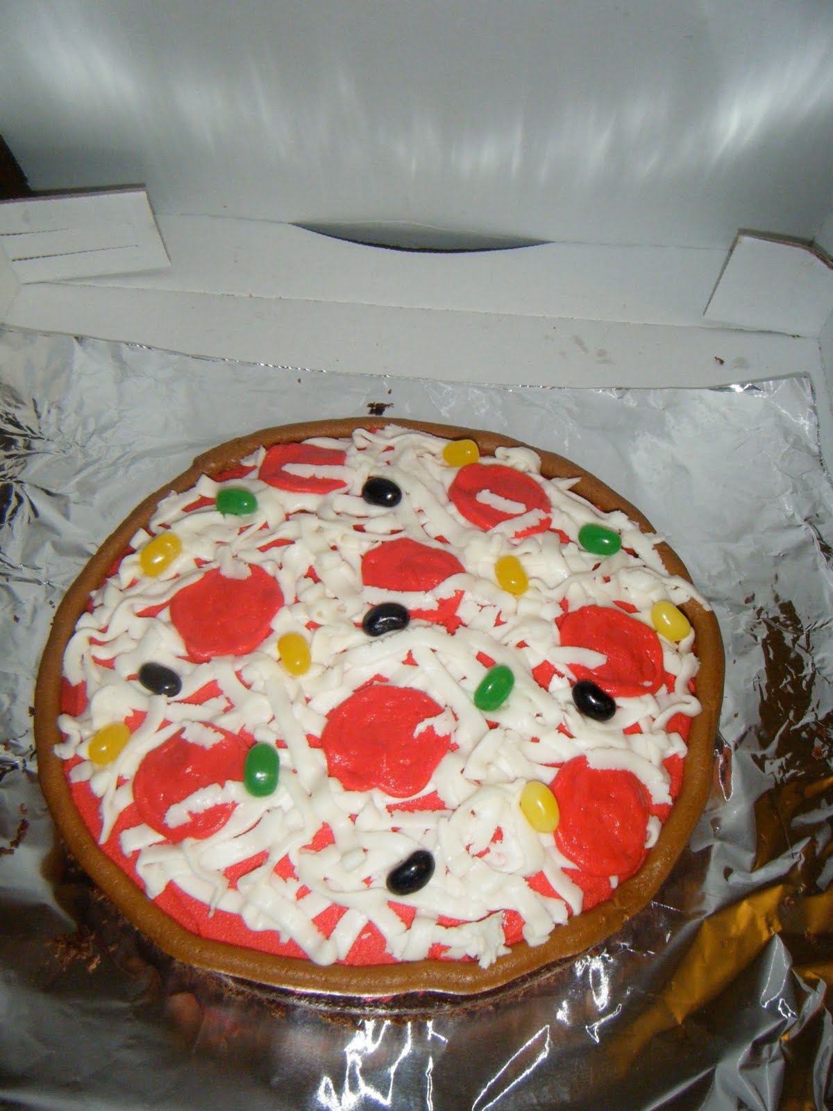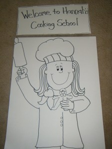 I had tons of fun planning a cooking party for Hannah. I hung this drawing on the front door. I made a pizza cake with just frosting tips. I used #7 tip for pepperoni then smoothed it out. Then #101 for the cheese, and #12 for the crust. It was just a round chocolate cake then put covered it with red frosting.